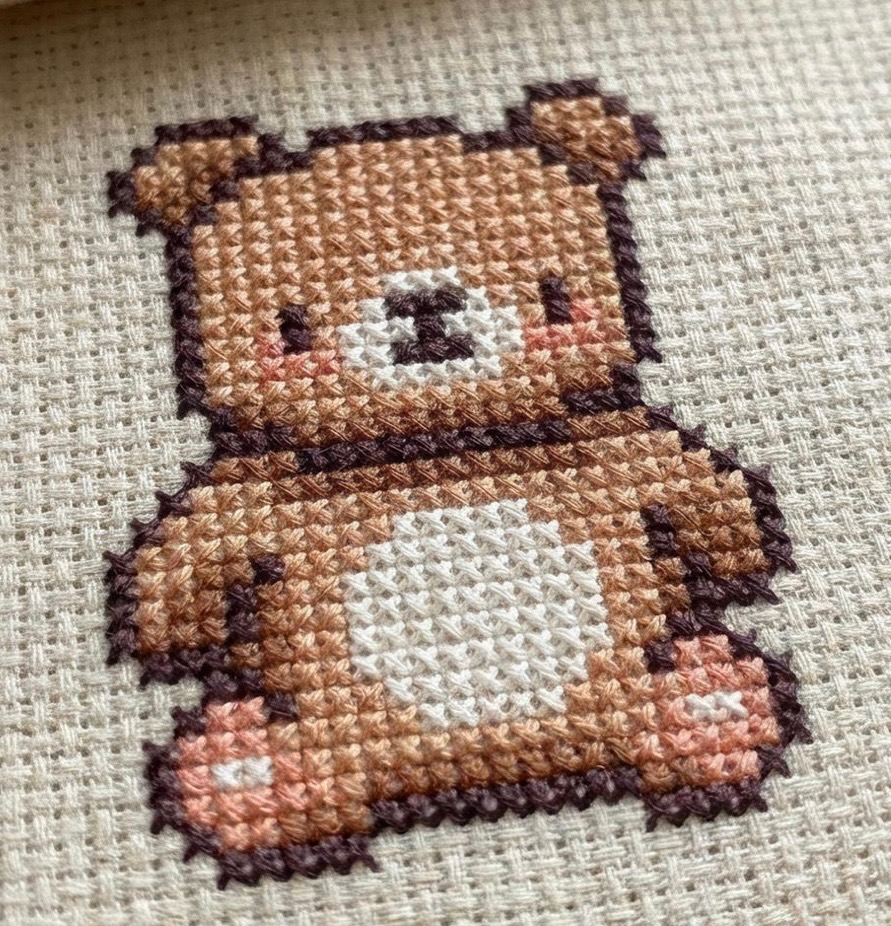 First, to create the design I had in my mind, I started on Pinterest for anything that looked close enough. I found this cross stitch teddy bear sitting up the way I wanted the cow to look, so I used it as my base.