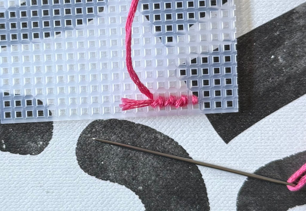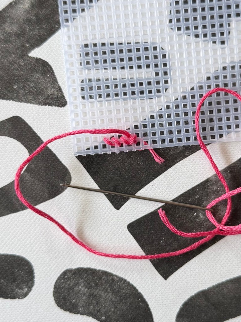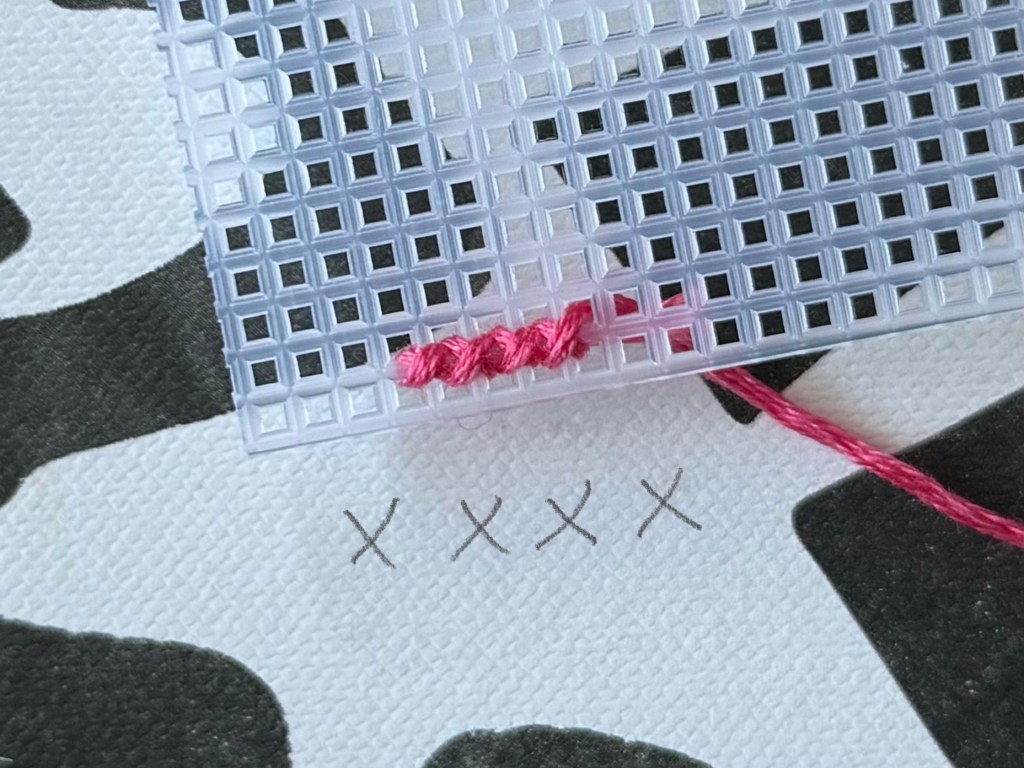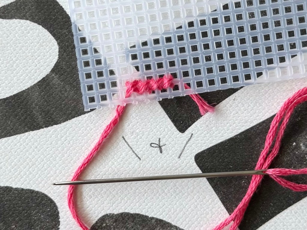 There are plenty of ways to start off your work, but I find it easiest to leave a tail of your thread on the backside of the grid, and stitch the first few x shapes to hold it down. You could do each x stitch at a time, or do a row of \ stitches before going back and doing the / stitch to finish the row. Either way will create a complete x stitch that holds the tail in place and will keep your work from loosening or coming apart. If you have a bit of extra thread after finishing your first row, that’s totally fine, because you can cut it right off.