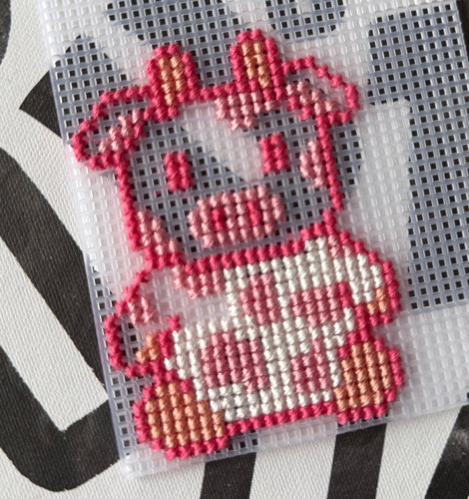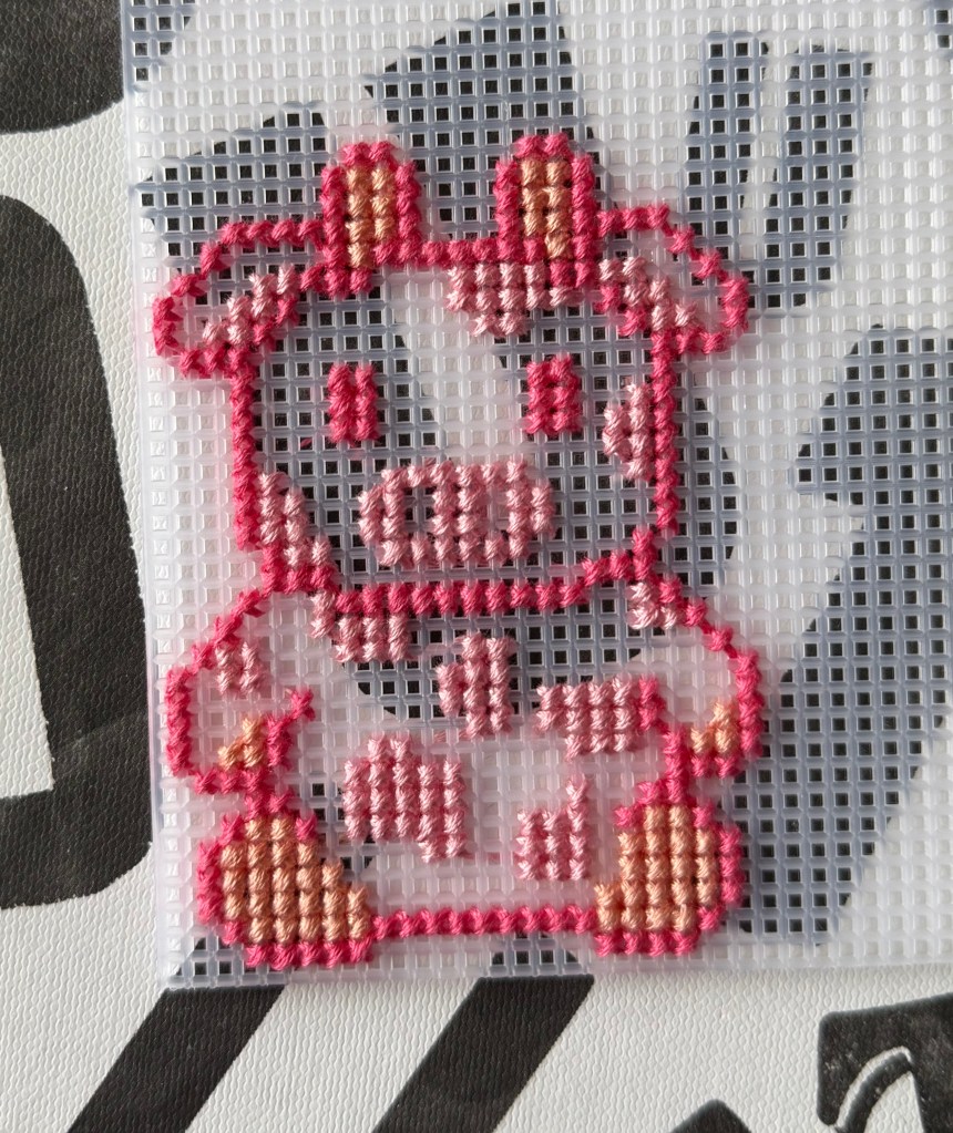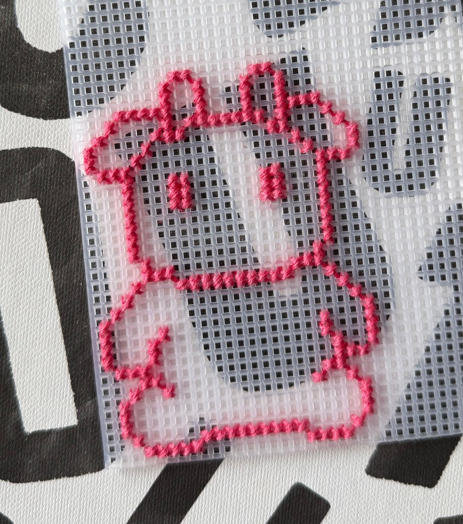 First, go ahead and use your darker pink thread to stitch the outline of the cow according to the template. Remember that the color blocks on the template are showing you the spaces in the grid where the plastic is, NOT the holes in the grid!! I will admit that confused me for a bit when I was first starting out and took me a bit to get used to.