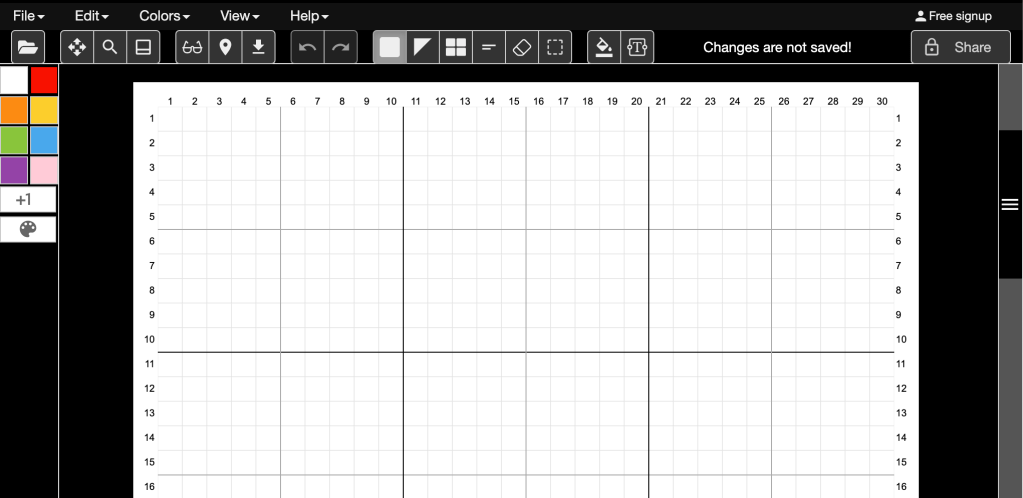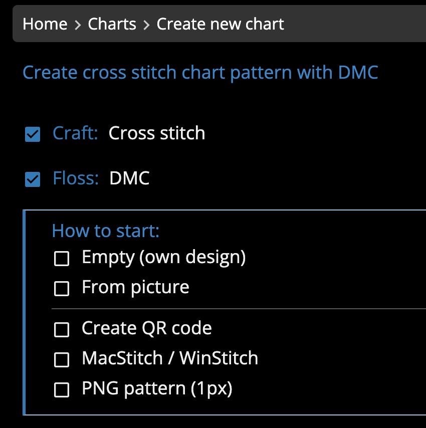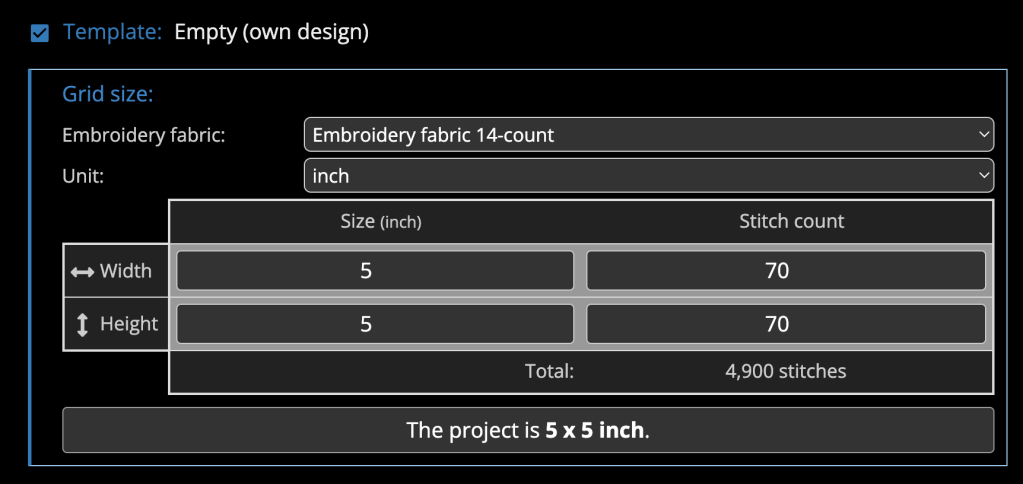 To create any of my templates, I use the website StitchFiddle. On this website, you’re able to click “create a new chart” to open up the options of what type of template you’re looking to make. For this project, I chose “cross stitch” with “DMC” as the color palette. From here, it brings you to a screen where you can choose from a variety of starting points.