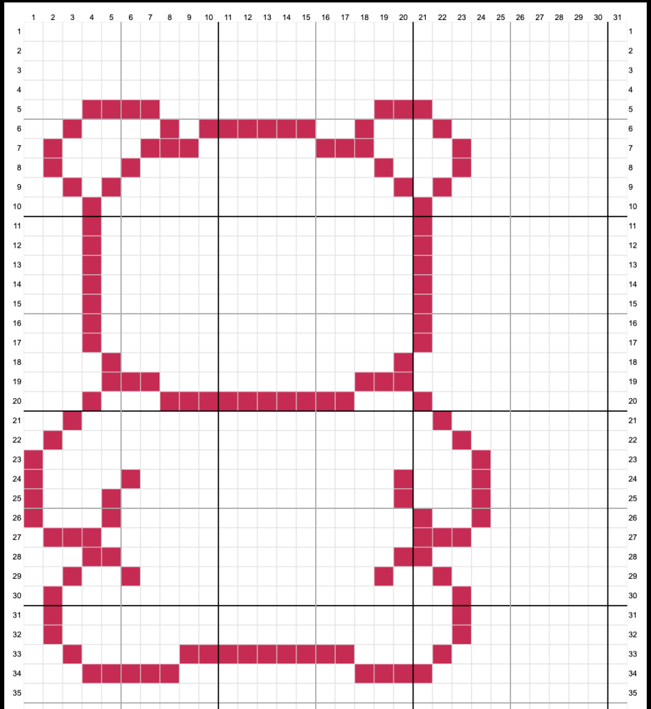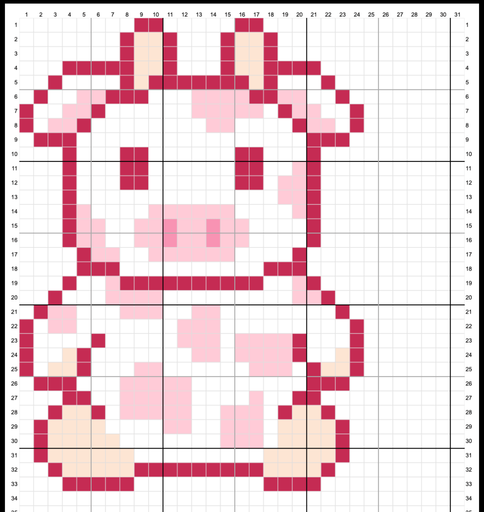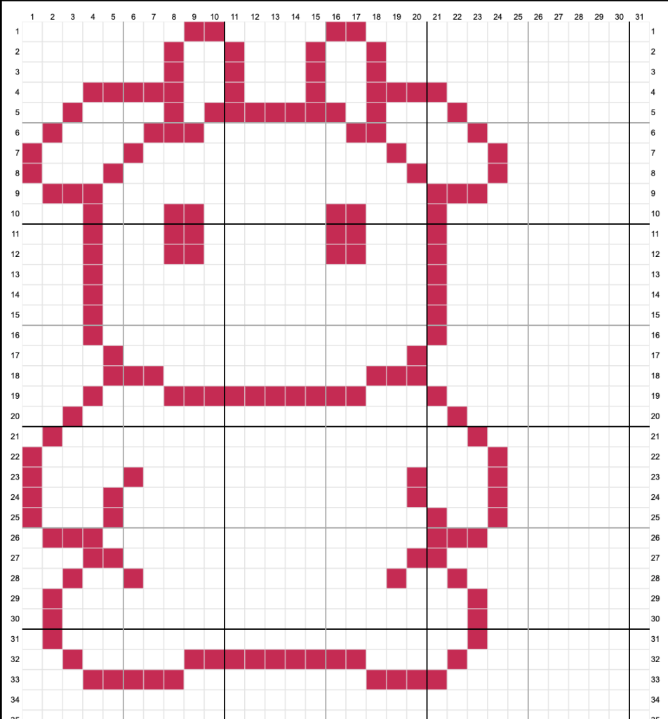 The final step is choosing the size of the blank chart (but, don’t worry, you can add and delete rows/columns at any point while you’re working)! For this cow project, I counted the stitches on the bear to get a rough idea of how large it would be. It was around 25 wide and 30 tall, so I set my blank template to be 30 wide and 40 tall for some extra buffer space.